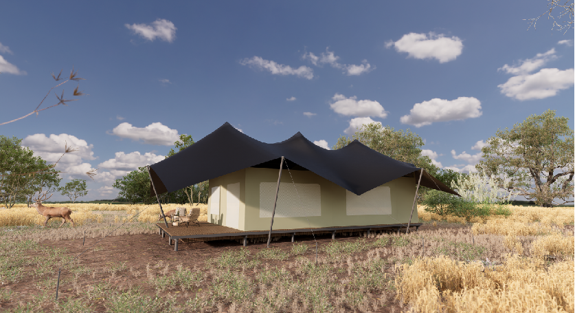 主材:优质碳钢钢管(氟碳漆防锈处理) 外膜:700g弹力布 内帐及墙体:帆布规格:6m*10m 套内面积:62㎡ 投影面积:142.97㎡ 产品面积:60㎡地台面积:94㎡ 抗风等级:6级以下